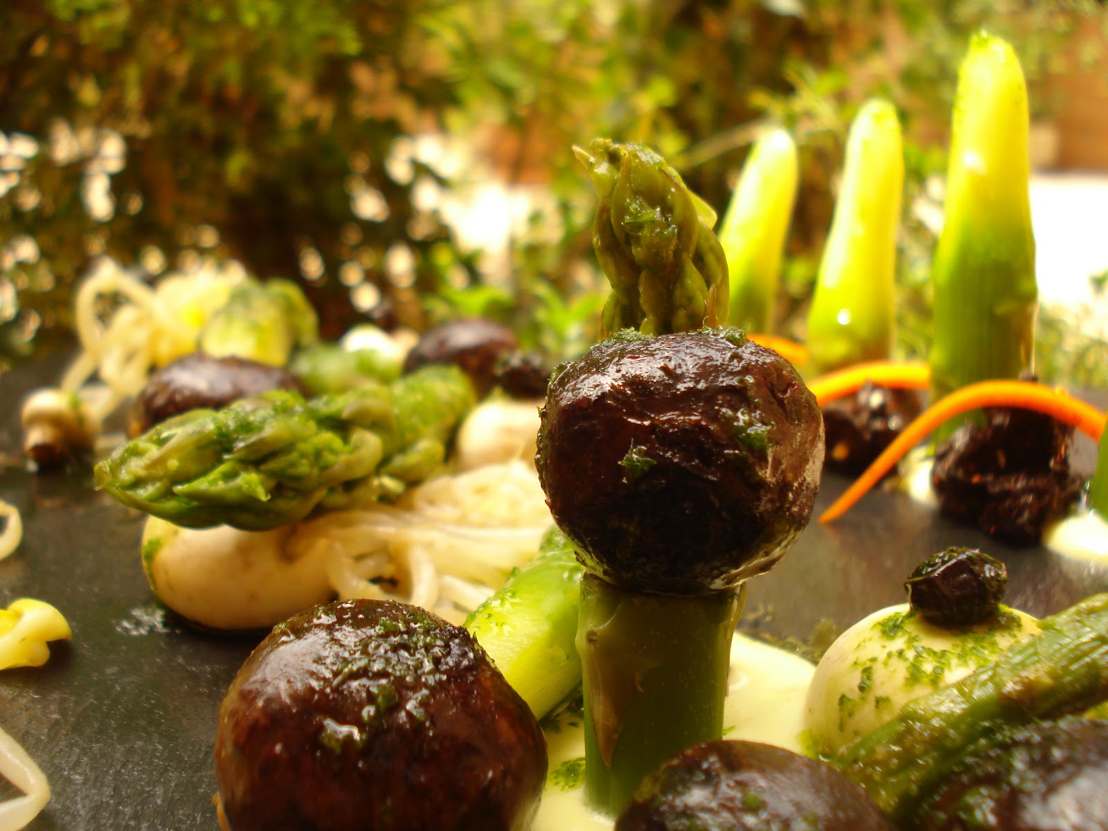 Primero trazaremos una lagrima ancha en el centro del plato, donde iremos disponiendo las yemas de los espárragos , champiñones , Delicias y brotes alternativamente en un lateral del plato pondremos cuatro cucharaditas de salsa donde pondremos los troncos perfilados de esparrago, y alternaremos entre ellos la alga nori con una tirita de zanahoria.