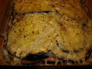 Despues en una fuente de horno, ponemos una capa de berenjenas, otra de lonchas de jamon, otra de queso y comenzamos otra vez con berenjena, hacemos esto un par de veces, terminando con berenjena. Espolvoremos con queso rallado y un poco de ajo molido y gratinamos en el horno 5 min. Listo para comer.