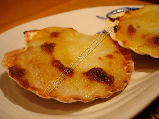 Retiramos del fuego y rellenamos la vieiras con la mezcla. Napamos con la bechamel y esparcimos un poco de pan rallado. Añadimos un trocito de mantequilla encima y metemos al horno a gratinar hasta que veamos que tiene colorcito.