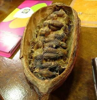 Aquí se ve el fruto del árbol del cacao y sus apreciadas pepitas...por cierto que siempre hay numero par, por la cosa de que salen una enfrente de otra....y entre 30 o 40 pepitas.