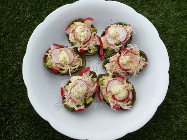 En la base de cada aguacate ponemos un poquito de mahonesa. Añadimos el aguacate cortado en cubitos, incluimos un poco de surimi desmigado y colocamos las medias lunas de rabanitos al rededor y encima del surimi (como podéis ver en la foto)