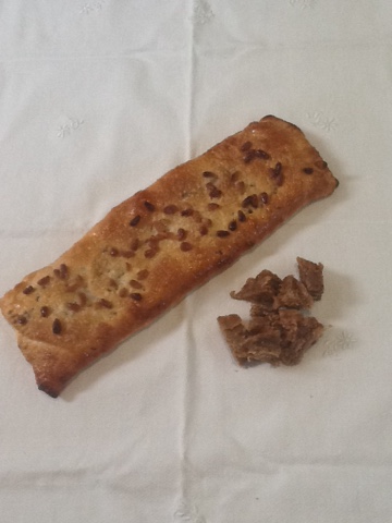 Estirem la làmina de pasta de full i li donem una forma rectangular. Posem la meitat dels llardons i sucre a la part central de la làmina i pintem la part superior i inferior amb anís. Tapem aquesta part amb l'altra part de la làmina i a sobre hi posem la resta de llardons, ho tornem a tapar amb la làmina que falta i ho aixafem tot amb un corró.