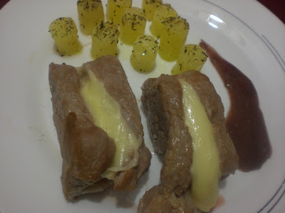 Corta el queso en lonchas gruesas y coloca entre los solomillos. Pincha con un palillo y ponlo a gratinar , que el queso se deshaga