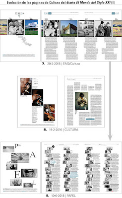 Unos diez años después, en octubre de 1998, y plenamente consolidado, se presenta el primer rediseño, que hemos calificado de "tipográfico", porque fueron principalmente los tipos de letra —en los que estaba impresa su identidad— los que se modificaron, incluido el de la cabecera, con aquella poderosa Rockwell que, lamentablemente, desapareció. Desde mi punto de vista, es el rediseño más fallido. Otra década después, en 2009, se lleva a cabo el tercer proyecto gráfico, muy condicionado por la brutal crisis económica. El diario intenta ofrecer una nueva forma de presentar la información ante la acometida digital y los cambios se centran no en la identidad tipográfica sino en la estructura de las páginas, además de contar ya con la posibilidad técnica de imprimirse todas sus páginas en color, permitiendo así establecer códigos cromáticos. En 2014, tras la traumática salida de su carismático director y fundador, Pedro J. Ramírez, Rodrigo Sánchez como nuevo director de Arte lleva a cabo una nueva propuesta en la que se modifica el color del logo, pasando la bola del mundo diseñada por Cruz Novillo del verde al azul, se elimina lo que podríamos llamar "maltrato tipográfico" (adiós a estrechamientos y demás torturas a las pobres letras) y el diario se divide de forma mucho más acusada que en las etapas previas en dos partes muy diferenciadas buscando también una propuesta que resulte complementaria con el mundo digital. En esta segunda parte del periódico, se despliega un abrumador derroche de creatividad diaria en el que todas las normas del diseño modular saltan por los aires en busca del más excelente periodismo visual que posiblemente se haya visto nunca en nuestro país. Etapa que concluye en junio del año pasado, cuando el actual director, Joaquín Manso, decide prescindir de su genial director de Arte.