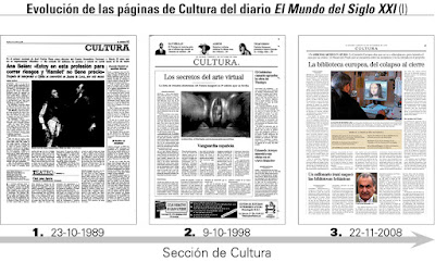 Evolución de las páginas de la sección de Cultura a lo largo de los sucesivos rediseños, desde el proyecto original de 1989 hasta el rediseño previo al actual, de 2014.