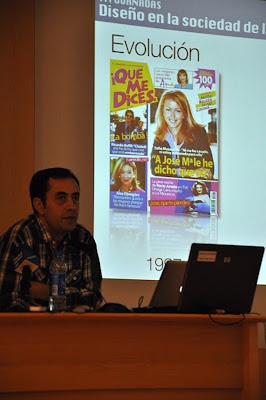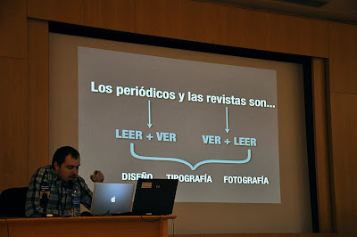 Nuestro encajabaja Luis Blasco, miembro de la sección de Diseño del diario El Mundo de Madrid como ya sabéis quienes sois lectores habituales de este blog cuyo creador fue precisamente él, sorprendió a propios y extraños con una soltura y un desparpajo impropios de quien se estrena en estas lides, siempre algo intimidantes. Y así, dejando atrás nervios y con ese dejarse querer tan suyo comenzó su conferencia analizando los elementos que diferencian a periódicos y revistas desde el punto de vista del diseño periodístico.
