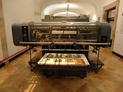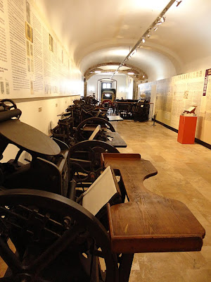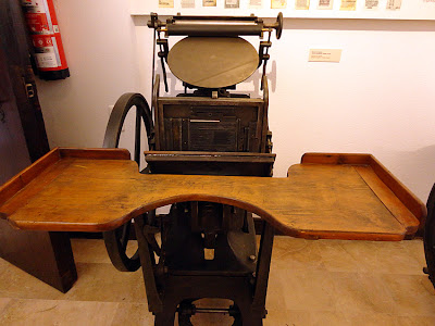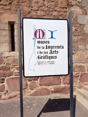 Completísimo recorrido, pues, a través de toda la historia de la imprenta desde Gútenberg hasta hoy el que nos ofrece el Museo de la Impremta i de les Arts Gràfiques del Puig en un edificio renacentista, además, absolutamente impresionante pero que ese día estaba cerrado. Claro que no nos importó porque, al final, el guía y portero se encargó durante la mañana de ir formando un grupo con los visitantes del museo con los que quedó en la puerta para, una vez cerradas sus salas, comenzar una visita guiada bajo cuerda y a cambio de "la voluntad" que él mismo fijó en varios euros por persona. Recorrimos diversas estancias en voz baja, asomando primero la cabeza antes de entrar "por si hay moros en la costa", el magnífico y luminoso claustro, la muestra de incunables... shsss!