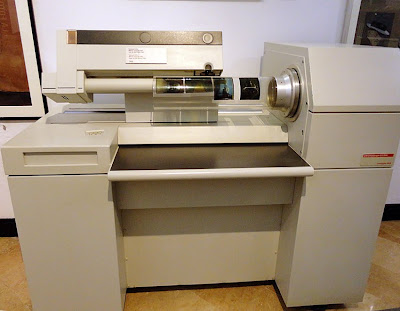 Evolución de la denominada composición en frío posterior a la linotipia: la fotocomposición, procedimiento que utilizaba fotografía controlada por ordenador y la posterior digitalización absoluta de los actuales sistemas de autoedición representadas por un Mac