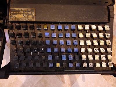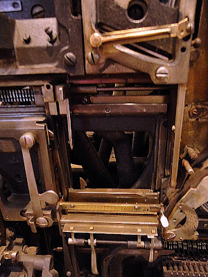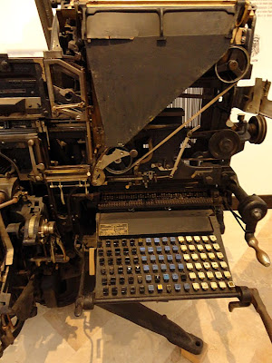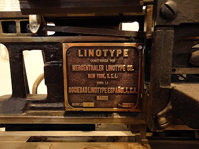 Linotipia, con varios detalles. El antepasado directo de nuestros teclados. De la composición manual se pasó a la mecánica, con la denominada composición en caliente, porque fundía líneas de texto en plomo según se iban componiendo