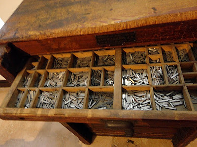 También hay en esta primera sala cajas de imprenta y chivaletes con tipos móviles de distintas familias y cuerpos, junto con el resto de útiles para la llamada composición manual, porque los textos se creaban carácter a carácter...