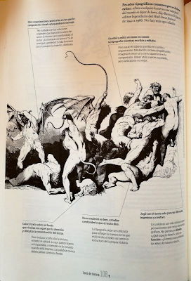 Porque incluso hay lugar para un agudo sentido del humor de su autor. Fíjense cómo castiga a los 'pecadores' que se atrevan a jugar con el texto "sólo para ser diferentes, ingeniosos y creativos", a quien "escribió y editó sin tener en mente la tipografía", a quien "hizo organizaciones arbitrarias en las que la composición visual sobrepasaba el mensaje", a quien "colocó un texto sobre un fondo que rivaliza con aquél por la atención y dificulta la concentración del lector", o a ese otro, u otra, que "no se molestó en leer, estudiar o entender lo que el texto dice". ¡Con el infierno y a latigazos!, valiéndose de una ilustración de Gustavo Doré para la Divina Comedia de Dante, sobre la que compone los textos. Pura comunicación visual y equilibrio. Genial.