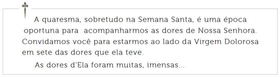 Unidos à dor que Maria sentiu nessa ocasião, peçamos forças e graças para suportarmos com paciência todas as dores de nossas vidas, e para nos maternos afastados do pecado.