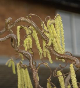 Corkscrew Hazel : is displaying his man-parts. they dangle and flap in the wind, sharing pollen. This may be why I have slight hay-fever symptoms.