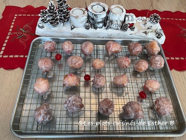 Cette année pour les fêtes j'ai voulu fait changement des beignes traditionnels. Ces beignets sont dignes d'une beignerie très populaire. Un vrai péché qui goût vraiment la cerise! C'est tendre à souhait. Pour obtenir ce résultat j'ai du faire quelques ajustements, j'ai rajouté de la farine (pâte beaucoup trop molle) et j'ai doublé la recette du glaçage. Malgré ça je vais sûrement refaire la recette:)