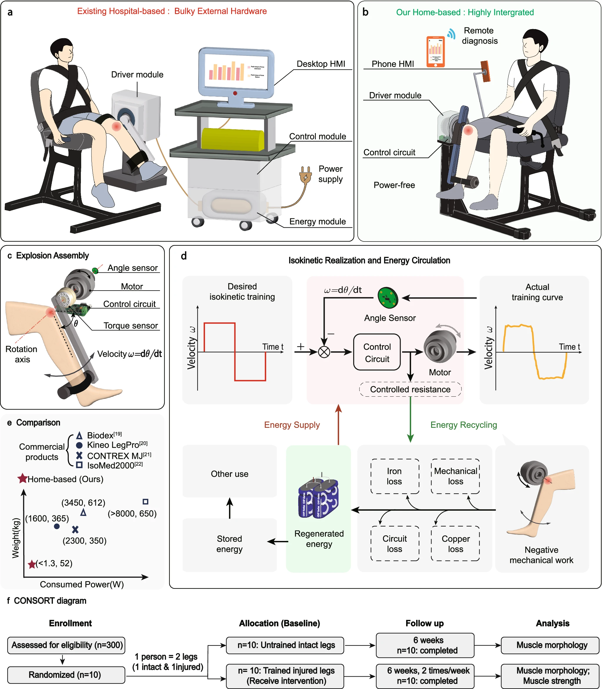 In the study, the authors introduce a highly integrated and lightweight (52 kg) knee rehabilitation robot that can provide home-based isokinetic training without external power. By integrating a motor, torque/angle sensors, control circuit, and energy regeneration circuit into a single driver module, the robot can provide power-free isokinetic training by recycling mechanical work from the trainee.