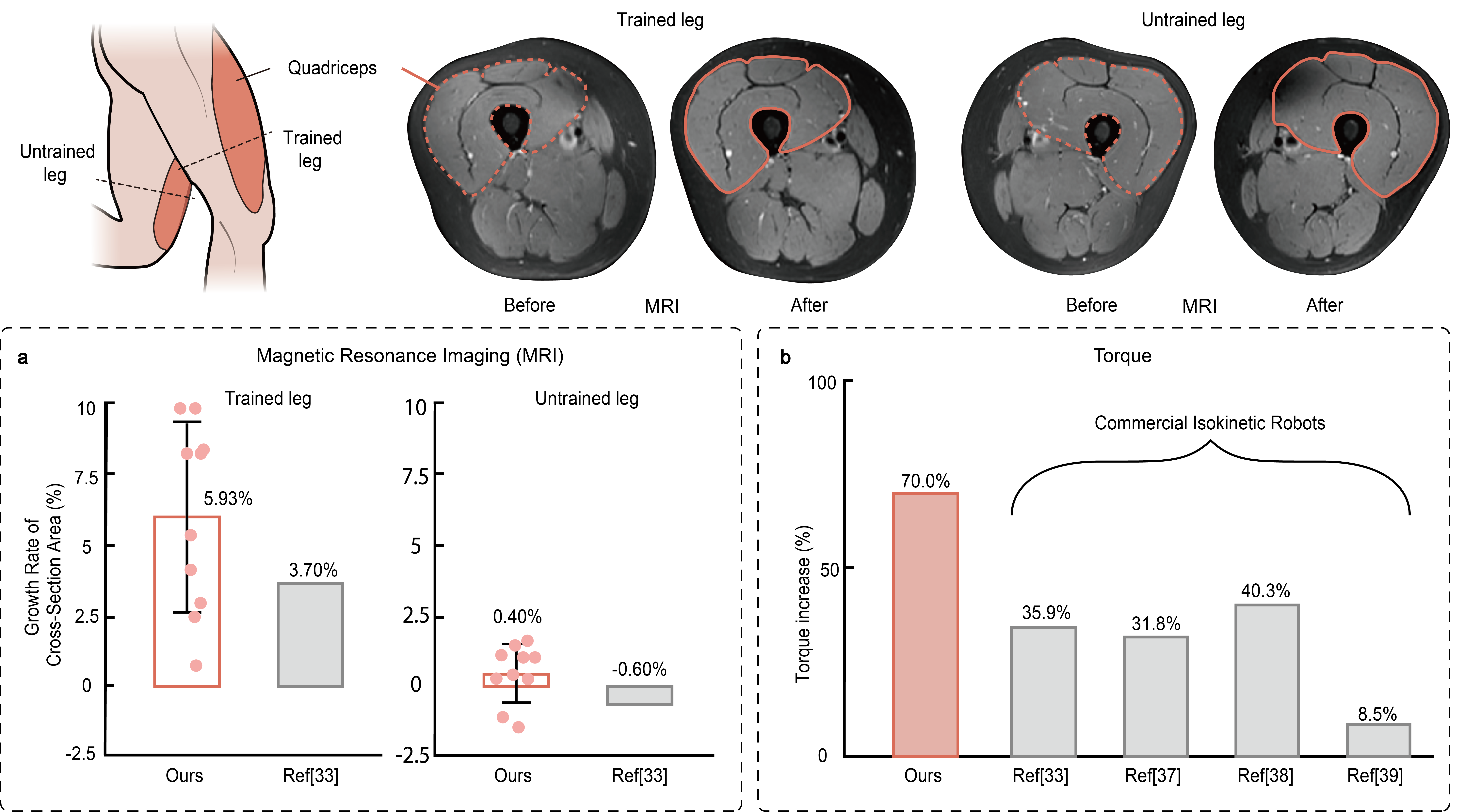 An interventional randomized trial involving ten postsurgical patients demonstrates that the cross-sectional area of trained legs (experimental group) was significantly higher than that of untrained legs (control group). The primary outcomes, muscle growth (quadriceps: 5.93%, hamstrings: 10.27%) and strength improvements (quadriceps: 70%, hamstrings: 84%), achieved with robots developed by the authors surpass those of existing commercial rehabilitation devices.