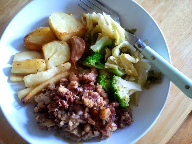 Cook the onion in the oil until soft and starting to caramelise, and then add the herbs, garlic, mushrooms, and nuts. Season well, and fry until the mushrooms are nicely browned. Make up the Paxo stuffing mix with hot water, and then combine with the mushrooms. You could of course just use an equivalent amount of fresh breadcrumbs and sage, but I genuinely think the Paxo mix (with its extra dried onions, garlic powder, and herbs) adds a flavour boost as well as bulk. The nut roast is basically all cooked, but I assemble it in advance, put into a shallow baking dish, drizzle the top with a little olive oil, and pop into the lower part of the oven at gas mark 6 for around 30 minutes (when the roast vegetables are in). The top should be browned, but be careful not to let it dry out. I have to say that this resulted in an excellent roast dinner.