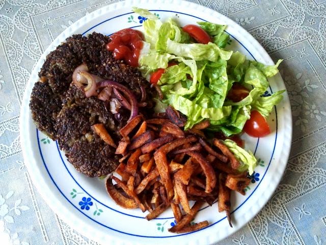 So firstly, I didn't have things like ground flaxseed and nutritional yeast which the Jurker uses in his recipe. I subbed those and the breadcrumbs for quinoa and Marigold stock powder. I find this quite salty too, so didn't bother adding any more to the mix. I also didn't read the bit about cooking the vegetables first. So I basically put everything above, except the nuts and quinoa, in the food processor and pulsed and until it had a suitably coarse burger-like texture. I then added the other ingredients put it all in the fridge overnight. The mixture turned out to be a little on the wet-side but not too sloppy. When it came to dinner time, I heated up a thin layer of oil in a non-stick frying pan, took a heaped tablespoon of the burger mix and plopped into the pan, using the back of the spoon to push it down and shape it a bit. These needed around 3-4 minutes on each side to form a crust and colour up. They were just about robust enough to be flipped over and later manoeuvred onto a plate. I'm pretty sure that a lot of moisture was coming from the raw mushroom, so I will definitely cook these first next time, and that should make the patties a lot more robust. But nevertheless, these burgers tasted damn good. Lentil and mushroom immediately summons up some sort of stupid hippy, dippy cliché, but these were properly packed full of flavour and had a great succulent texture. I did think that a bit of melted cheese over the top would be an excellent addition, but obviously that's not very vegan, so some grilled onions and tomato ketchup were a very acceptable substitute. The burgers would be great in a bun with green leaves, but I kept mine au naturel and ate them with some sweet potato fries and a big salad.