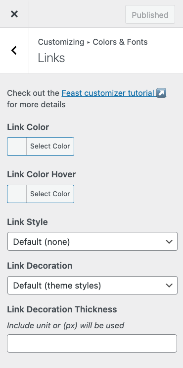 Note: for Feast+ users, the button color is automatically assigned to the Feast+ accent color, and all necessary accessibility adjustments are automatically made. For Feast+, this is set in the Feast+ branding page and is not available in the customizer.