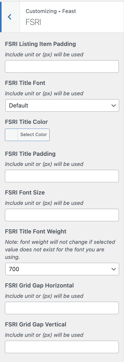 - FSRI Title Font Size (sidebar): the default for this is the sidebar font size, however you can increase this to make it more prominent.