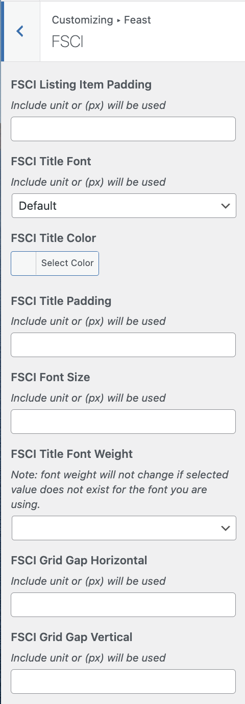 - FSCI Grid Gap Horizontal: this is the horizontal spacing between posts being displayed