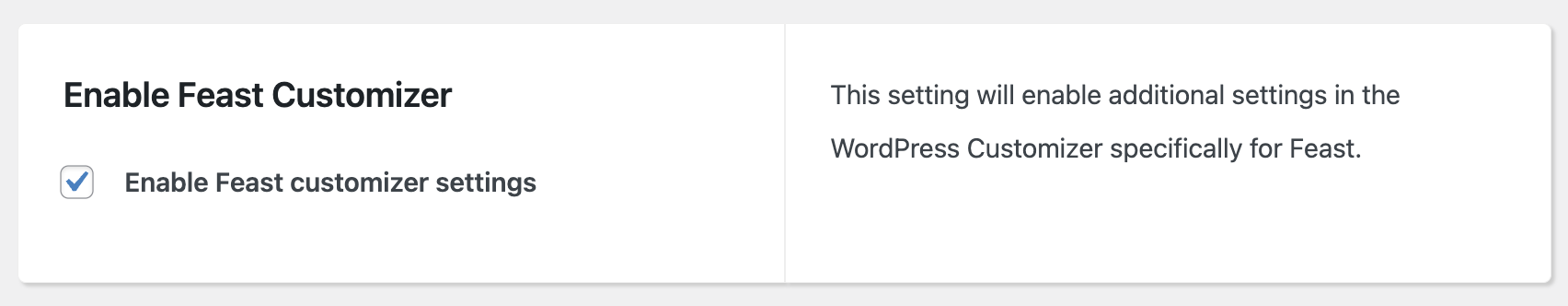 To enable Feast settings in the Customizer, visit Admin > Feast Plugin, enable it: