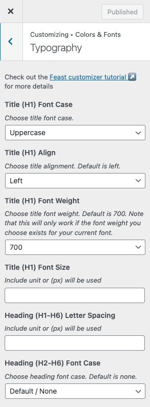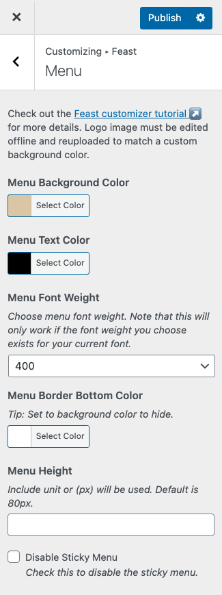 Note: for Feast+ users, the background color is automatically assigned to the Feast+ background color, and all necessary accessibility adjustments are automatically made. For Feast+, this is set in the Feast+ branding page and is not available in the customizer.