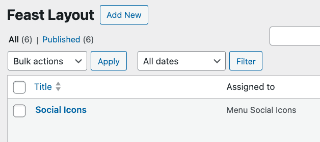 #5 - add the Feast Social Icons block to the new Menu Social Icons Feast Layout widget area in Admin > Feast Plugin > Feast Layouts:
