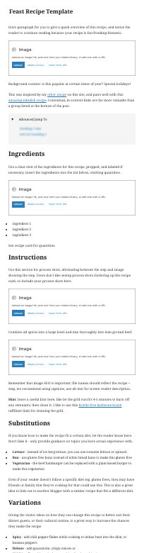 Introducing the Recipe Post Template, which creates a new post with key headings and sections all ready for you to fill out.