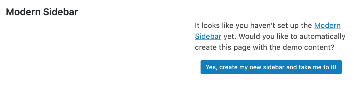 Navigate Admin > Feast Plugin > Setup and scroll to Modern Sidebar to automatically create the page by clicking the button: