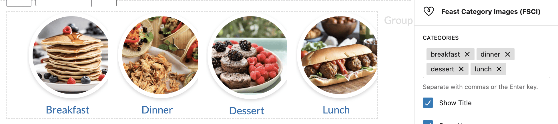 Using the Feast Category Image block without any parameters will display all your eligible category images and the category name, but this is not a good user experience and is not how it should be displayed.
