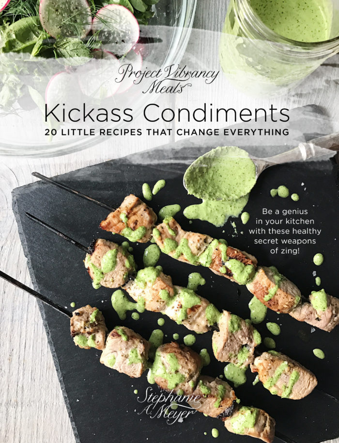 Kickass Condiments: 20+ Little Recipes That Change Everything is a PDF/ebook ($12) loaded with drinkable (seriously!) condiment recipes and tons of meal suggestions for how to use them.