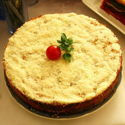 U terinu ili neku pametniju posudu - lim za kolače, vatrostalnu posudu ili što već - ređamo redom red prženih balančana, red salse od pomadora, red parmezana koji mora pokriti cijelu površinu. Zatim dalje - red balančana, red salse, red parmezana, i tako u nedogled ili dok ne presušite s materijalima. Kad je gotovo, pričekati da se ohladi tj. stisne, obrnuti da izgleda kao torta (ili izvaditi iz kalupa za tortu), posuti parmezanom, garnirati cherry rajčicom i bosiljkom i jesti dok se ne pojede.