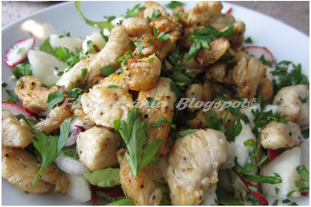 Pirított csirkemell csíkok saláta ágyon