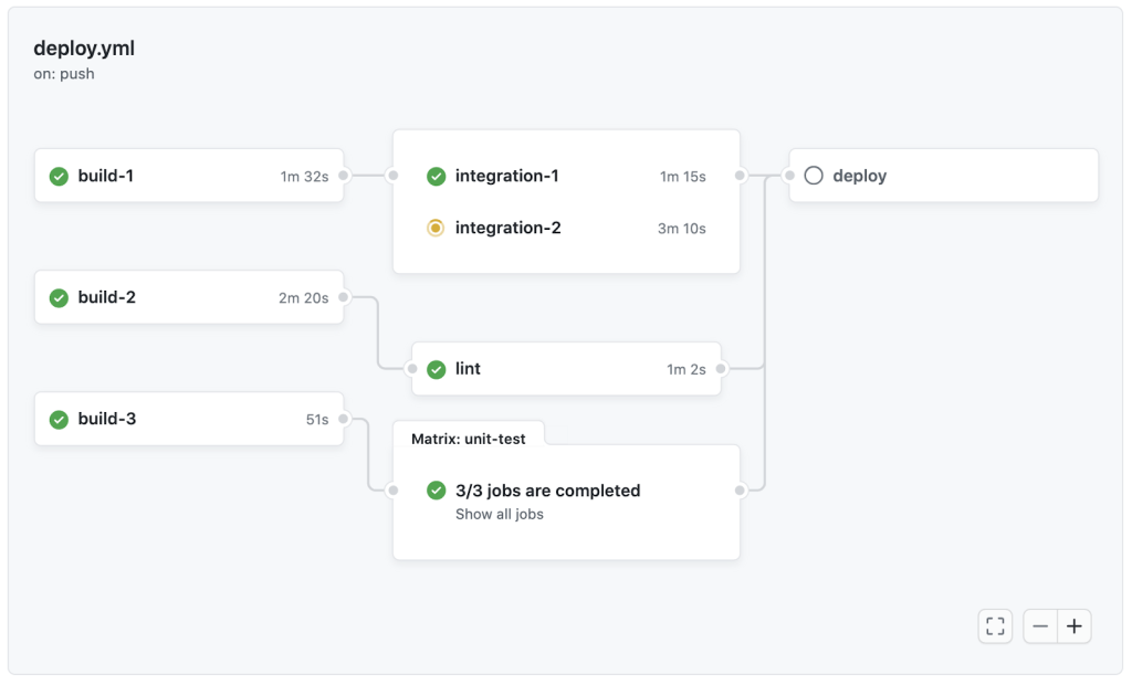 GitHub Actions runs multiple commands at the same time by default—but you can leverage the needs keyword to create dependencies between jobs. That means that if something like a test fails (or any job for that matter) dependent jobs won’t execute.