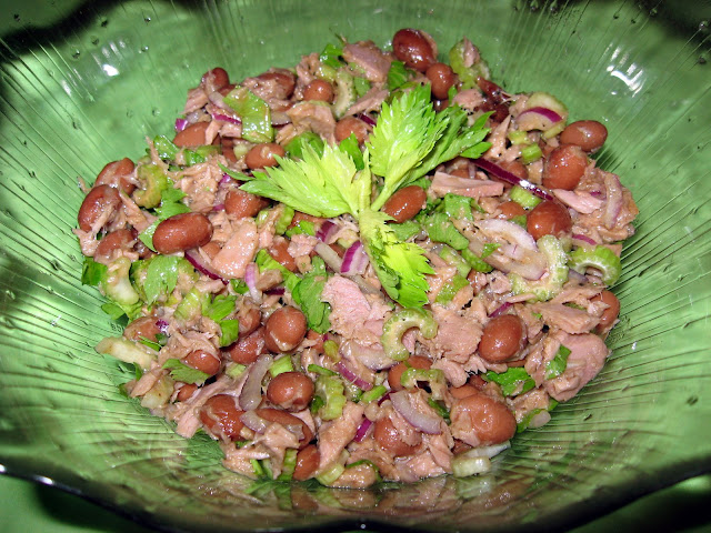 Fasolę i tuńczyka odsączyć z zalewy, łodygi selera pokroić w plasterki, cebulę w ćwierćplasterki, wymieszać składniki. Zrobić sos z oliwy, octu balsamicznego, musztardy, przyprawiając solą i pieprzem. Polać nim sałatkę, wymieszać.