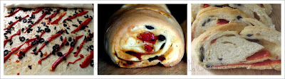 A lisztben elkevertem a sót, és mélyedést csináltam a közepébe. A vizet és a tejfölt összekevertem, feloldottam benne az élesztőt, a liszt közepébe öntöttem, egy kevés liszttel is összekevertem. Hagytam néhány percig állni, mehetett bele a kissé felvert tojás, az olívaolaj, és indulhatott a gép. Amikor a tészta már szépen elvált az edénytől, letakartam, és hagytam állni egy fél órát. Ezután deszkán újra átgyúrtam, két cipót készítettem belőle, és vártam még 20 percet. Ezután vékony lappá nyújtottam őket (lemértem: 30-35 x 40-45 cm-esre). A tésztát meglocsoltam olívaolajjal, a paprika szeleteket vékony csíkokra szedve ráfektettem, megszórtam az összevágott olívabogyóval, és a fűszerekkel. Feltekertem, aztán srégen bevagdostam a tetejét.