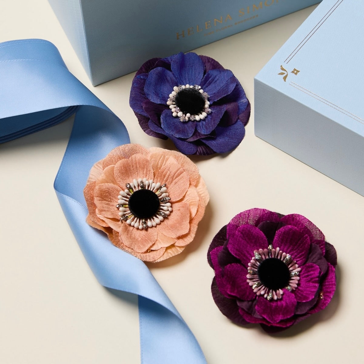 Hand-dyed petals, luxurious fabrics and one-of-a-kind embellishments make Helena Simon floral brooches beautiful works of wearable art.