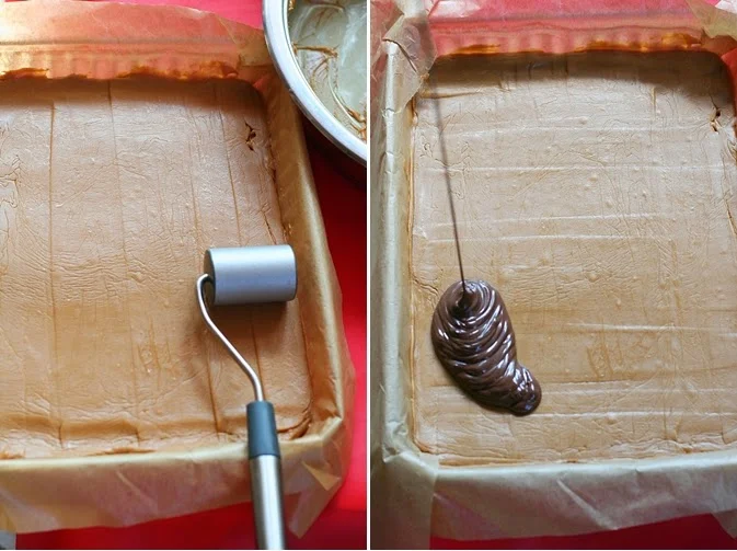 Стопете на водна баня шоколада и залейте с него останалите слоеве.