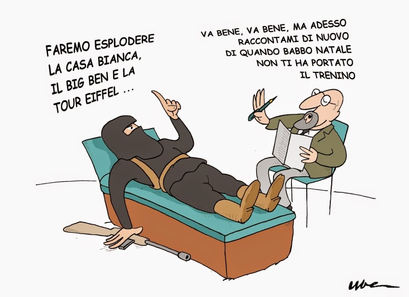 La prima frase è letterale ed è stata pronunciata nei giorni scorsi dal portavoce dell'ISIS Abu Mohammad al-Adnani.