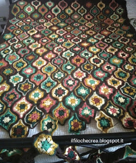 Devo dire però, che come spesso capita, in barba a tutte le normative sul copyright, in rete si trovano gli schemi per fare la coperta, anche a volte con delle leggere differenze rispetto all'originale. E' un malcostume, ma così è. Basta cercare su un motore di ricerca il nome del pattern. Troverete gli schemi e anche anche dei videotutorials su Youtube che insegnano a realizzare la piastrella e le mezze piastrelle. E anche uno prezioso videotutorial che insegna ad unire le piastrelle con l'uncinetto con un metodo che non conoscevo e che produce un effetto a cordoncino che mi piace tantissimo.
