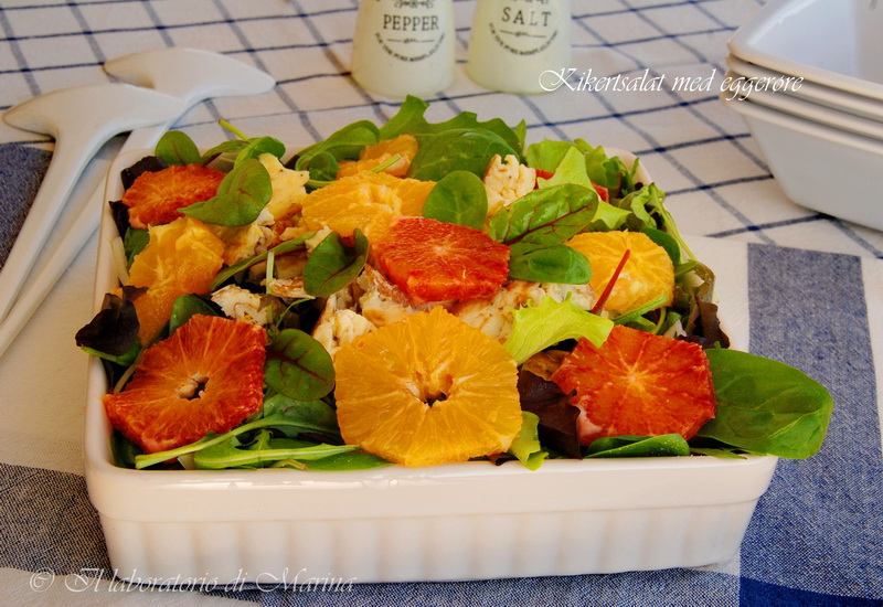 Oggi prepariamo una ricetta norveghese, proposta da Ornella. Kikertsalat med eggerøre in norveghese significa : insalata di ceci on uova strapazzate. Ricettina semplice e veloce per preparare un piatto unico low carb vegetariano. La ricetta proposta da Ornella potete vederla qui. Siccome i ceci in scatola non è un prodotto molto comune nei supermercati in Grecia, sono dovuta a cucinarli. Ho sostituito la margarina con il burro, perchè non la metto mai nella mia cucina! Per i mei gusti, che non sono poi amica delle uova strapazzate, a questa insalata avrei aggiunto un condimento ai ceci, p.e. una citronette con extra succo di arancia, o qualcosa del genere.
