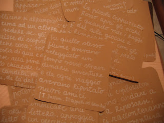 Fare questo "lavoro" per la sposa mi ha permesso di guardarmi dentro, di cercare, innanzi tutto nella memoria, qualcosa che mi facesse tornare alla felicità di un giorno grande come quello di ieri, senza retorica e con una buona dose si sincero sentimento. Poi, scrivere su pezzi di carta straccia con un pennarello bianco, appendere i fogli su spago da cucina, usare piccole mollette colorate e cercare quelle di legno per il bucato quando le prime terminavano, è stato un gioco da ragazzi!