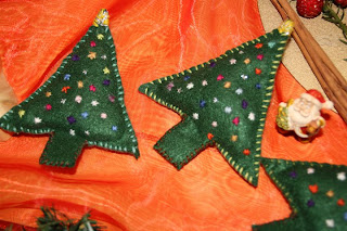 Quelli che vedete nella foto sono alberelli in pannolenci, ai quali sul retro ho cucito una spilla da balia. Possono essere attaccati all'albero, appesi in sequenza per creare un festone, incorniciati in un quadretto semplice (io l'ho fatto e il risultato non era male!), oppure usati come spilla, per chi è coraggioso e ha voglia di osare.