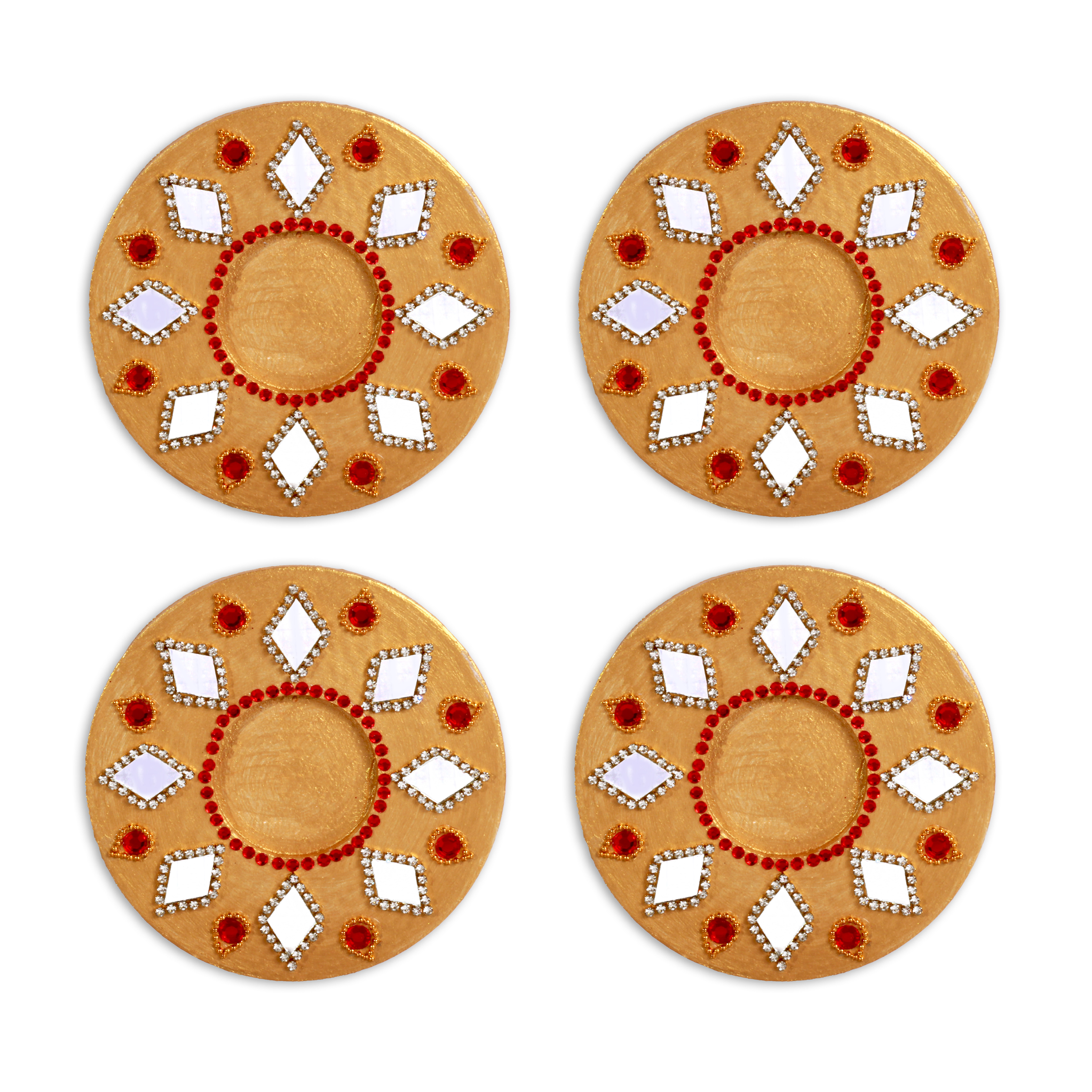 Mirror Work Tealight Holder Diamond Jewel Gold 4in Dia 5.5mm Thick 4pc - (Tealight Candle Included)