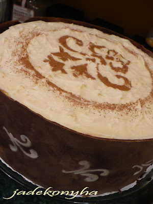 A tetején olvasztott fehér csoki, kakaóval meghintve. Az oldalán a Kiskuktánál látható videó alapján készült csokigallér, fehér csokoládé és tejcsokoládé kombinációjaként. Első próbálkozás, van még bőven tanulnivaló, remélem a legközelebbi sikeresebb lesz.