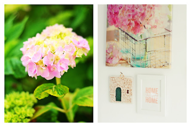 Čeprav ni v središču, je to središčna fotka te stene - foto print fotka hortenzij v vintage stekleničkah. Kar zaljubila sem se vanjo, na prvi pogled. Letos sem eno vzcvetelo že videla in jo kar prilimala tu zraven! Komaj čakam, da se razbohotijo v svojem cvetu.