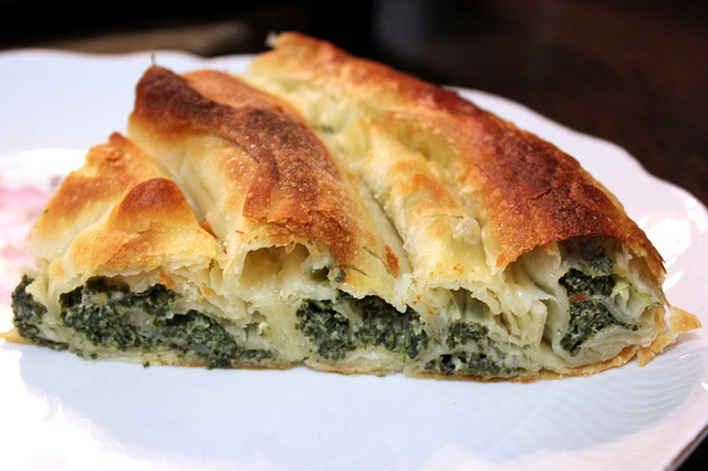 Kad tijesto odstoji podijeliti ga na dva dijela za dvije pite. Svaku polovinu razviti na dobro pobrašnjenoj površini, kalupom izrezati dio koji ide dolje i još jedan koji ide preko fila. Jedan dio složiti u kalup i premazati umućenim jajetom, sipati fil a odozgo staviti drugi dio tijesta. Krajeve pritisnuti rukom da se fino prilijepe, pa onda nožem napraviti proreze na kori da bi tuda mogla da izlazi para. Od krajeva se mogu napraviti ukrasi za pitu. Ja sam ovaj put prije postavljanja gornje kore kalupima za cvjetice napravila proreze na tijestu a cvjetice koje sam dobila sam takođe iskoristila i postavila kao ukras na gornju koru.