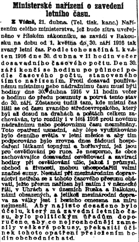 Oznámení o letním čase v roce 1916, 1918 a poznámka z roku 1931 v dobovém tisku