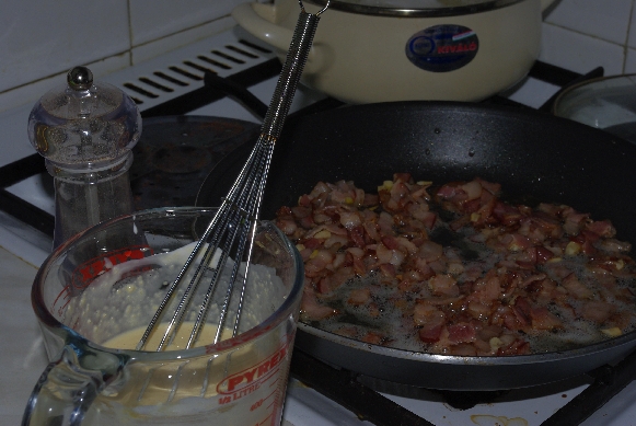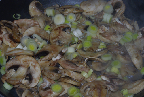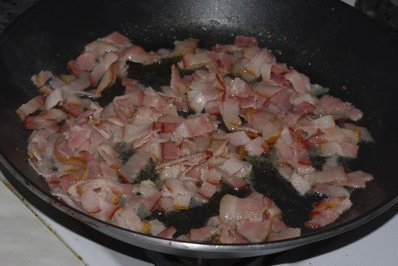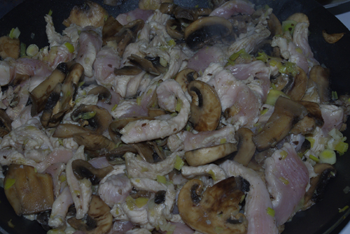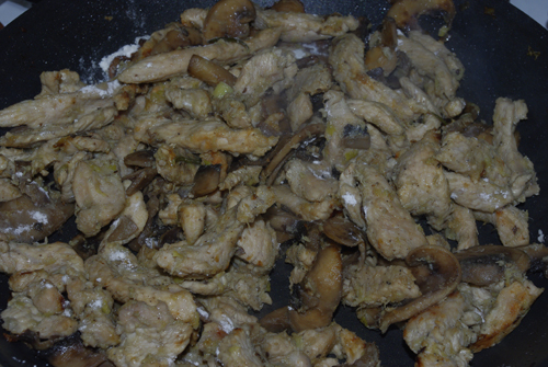 A csirkét felkockáztam, és olajon pár perc alatt kifehérítettem. Megsóztam, megborsoztam és szórtam rá egy kevés ételízesítőt is.